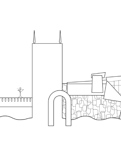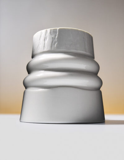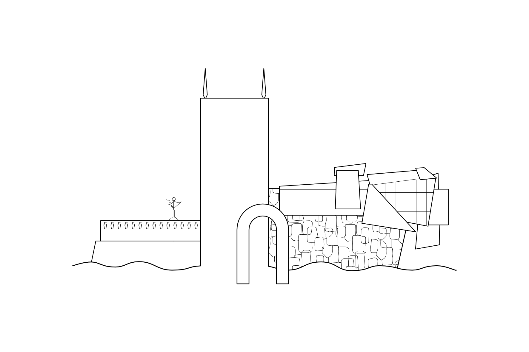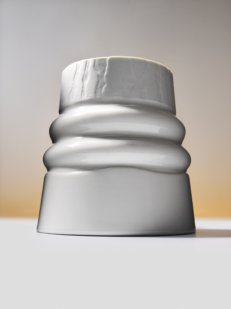 Van boven naar beneden: De golvende lijn refereert aan het water. Niet een kenmerk van het gebouw an sich maar wel bepalend en bijzonder aan de locatie van het gebouw. Het middenstuk verwijst naar het silhouet van de pilaartjes in het hekwerk, dat de paviljoens met elkaar verbindt. Tenslotte is de onderkant van het kopje een verwijzing naar de onderrand van het middelste paviljoen van het museum. Om het relief extra goed uit te laten komen en contrast te brengen in de combinatie met de andere delen, hebben we het onderste deel ongeglazuurd gelaten.